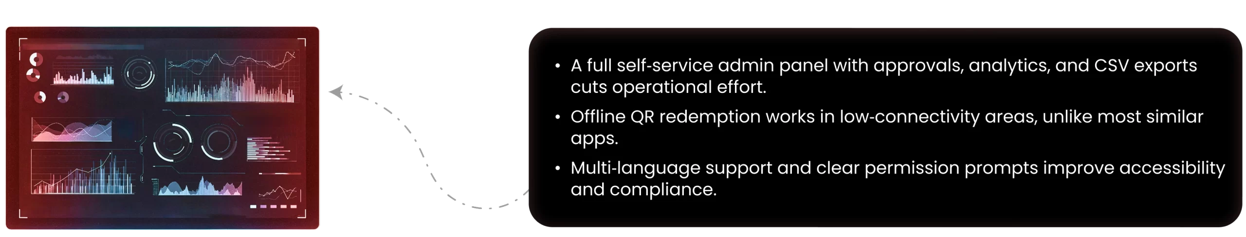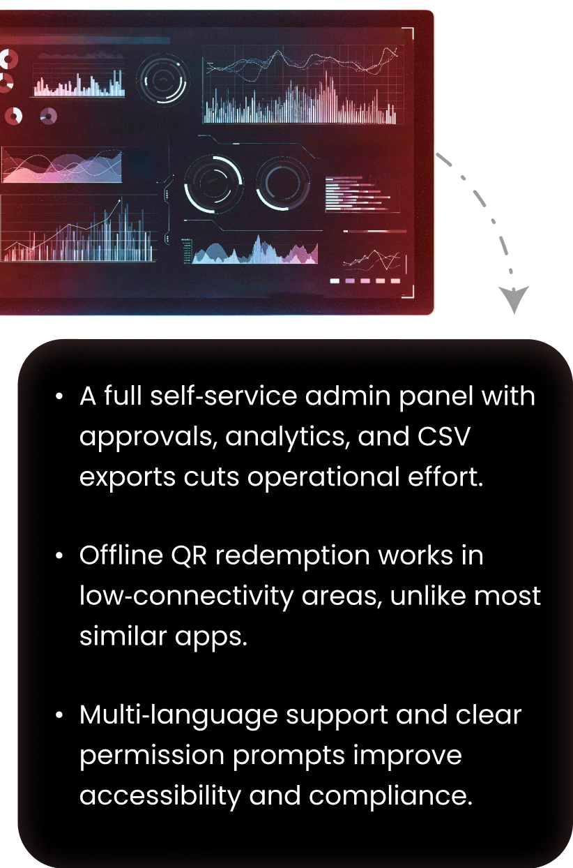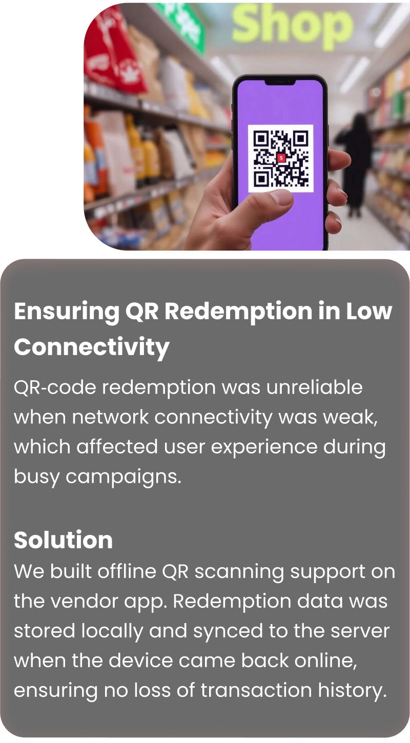 We built offline QR scanning support on the vendor app. Redemption data was stored locally and synced to the server when the device came back online, ensuring no loss of transaction history.
