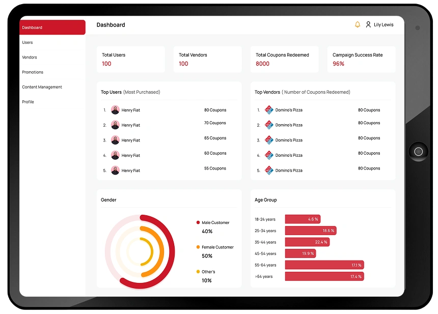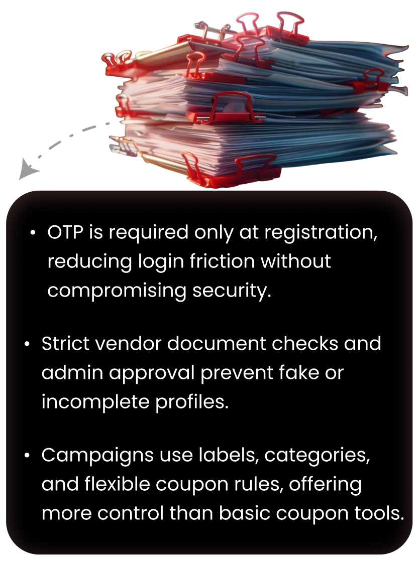 For admins, we developed a powerful dashboard to manage users and vendors, approve campaigns, control coupon categories, update content, send targeted notifications, and access real‑time analytics with CSV export options.