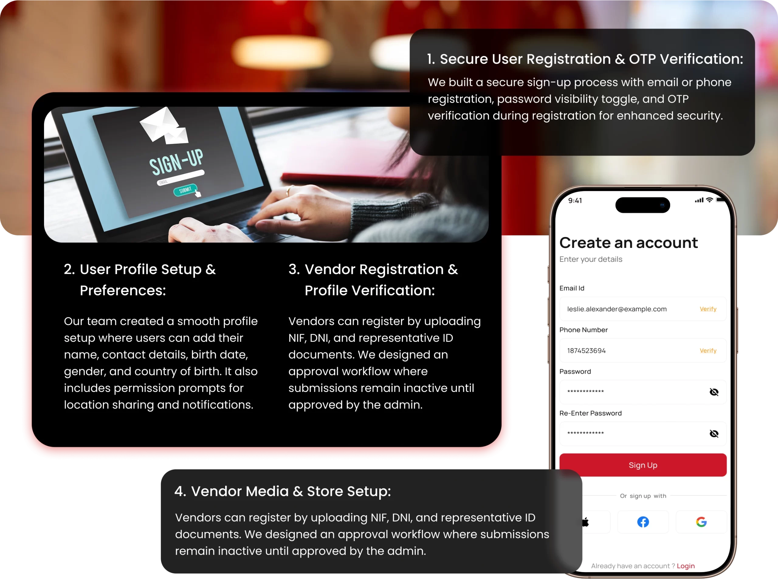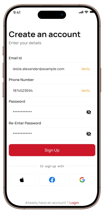 We built a secure sign-up process with email or phone registration, password visibility toggle, and OTP verification during registration for enhanced security.