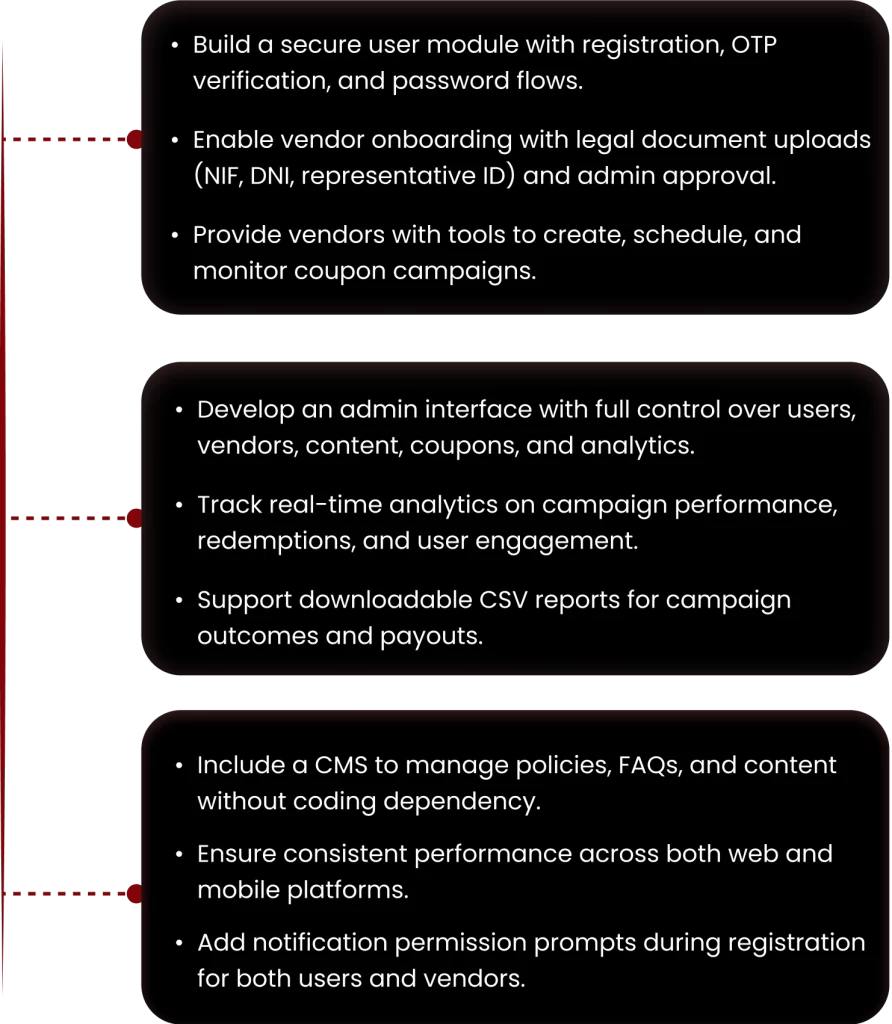 The project focused on building a secure and scalable platform for digital payments, coupon programs, and vendor management, while keeping the experience simple for all users. To achieve this, the following key objectives were defined: