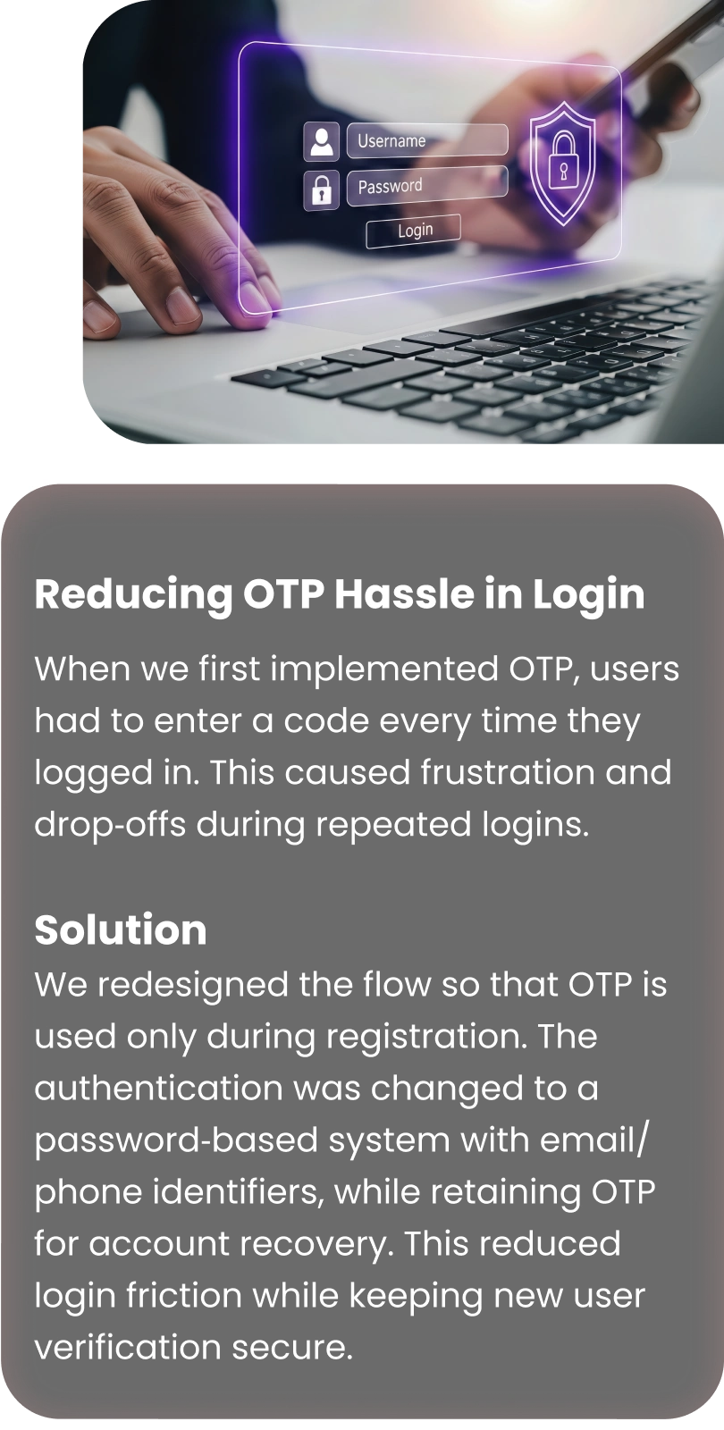 We redesigned the flow so that OTP is used only during registration. The authentication was changed to a password‑based system with email/phone identifiers, while retaining OTP for account recovery. This reduced login friction while keeping new user verification secure.