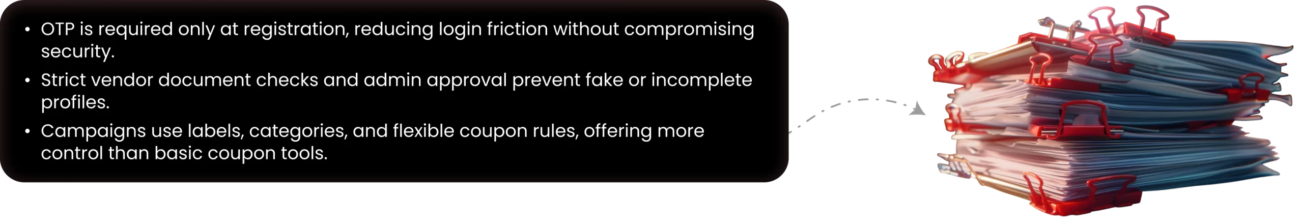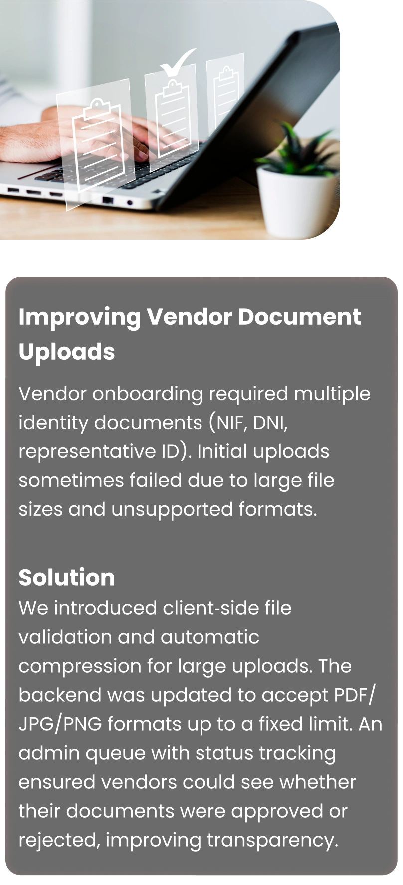 We introduced client‑side file validation and automatic compression for large uploads. The backend was updated to accept PDF/JPG/PNG formats up to a fixed limit. An admin queue with status tracking ensured vendors could see whether their documents were approved or rejected, improving transparency.