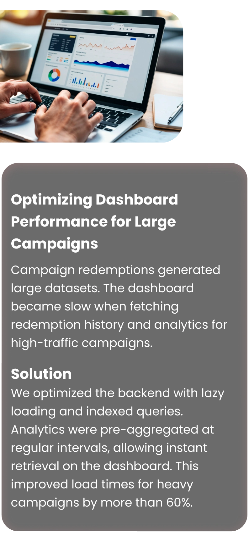 Campaign redemptions generated large datasets. The dashboard became slow when fetching redemption history and analytics for high-traffic campaigns.