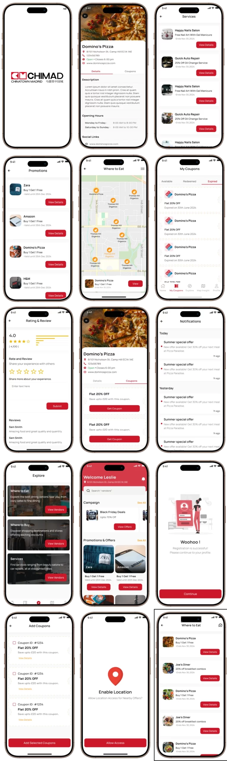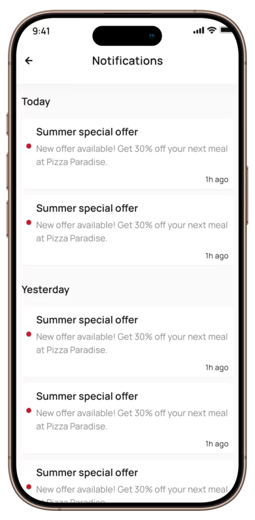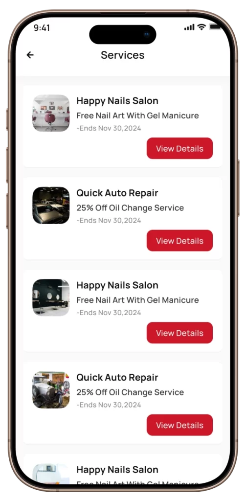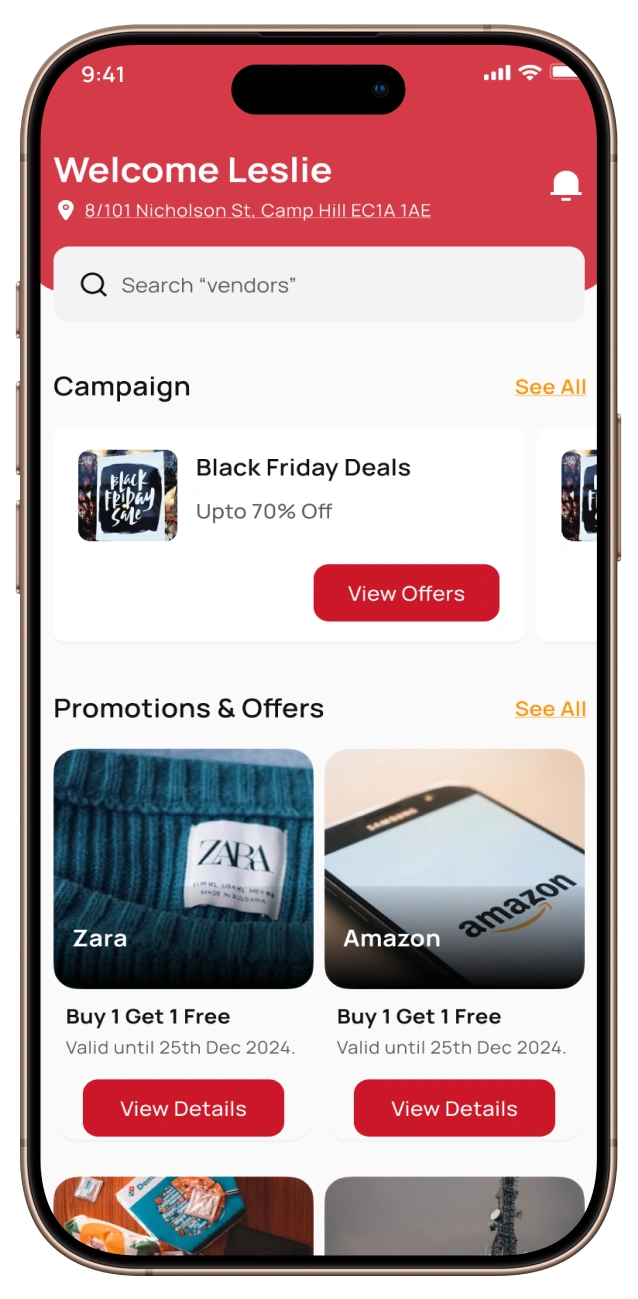 Push notifications alert users about new promotions or upcoming campaign expiries. Users can rate vendors, and admins can view feedback to monitor service quality.