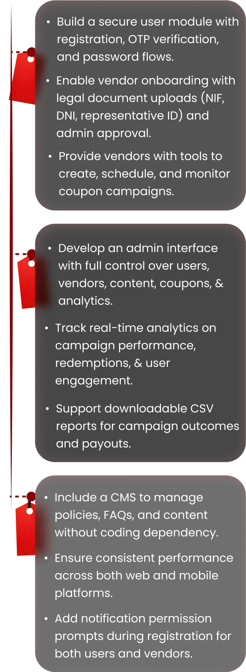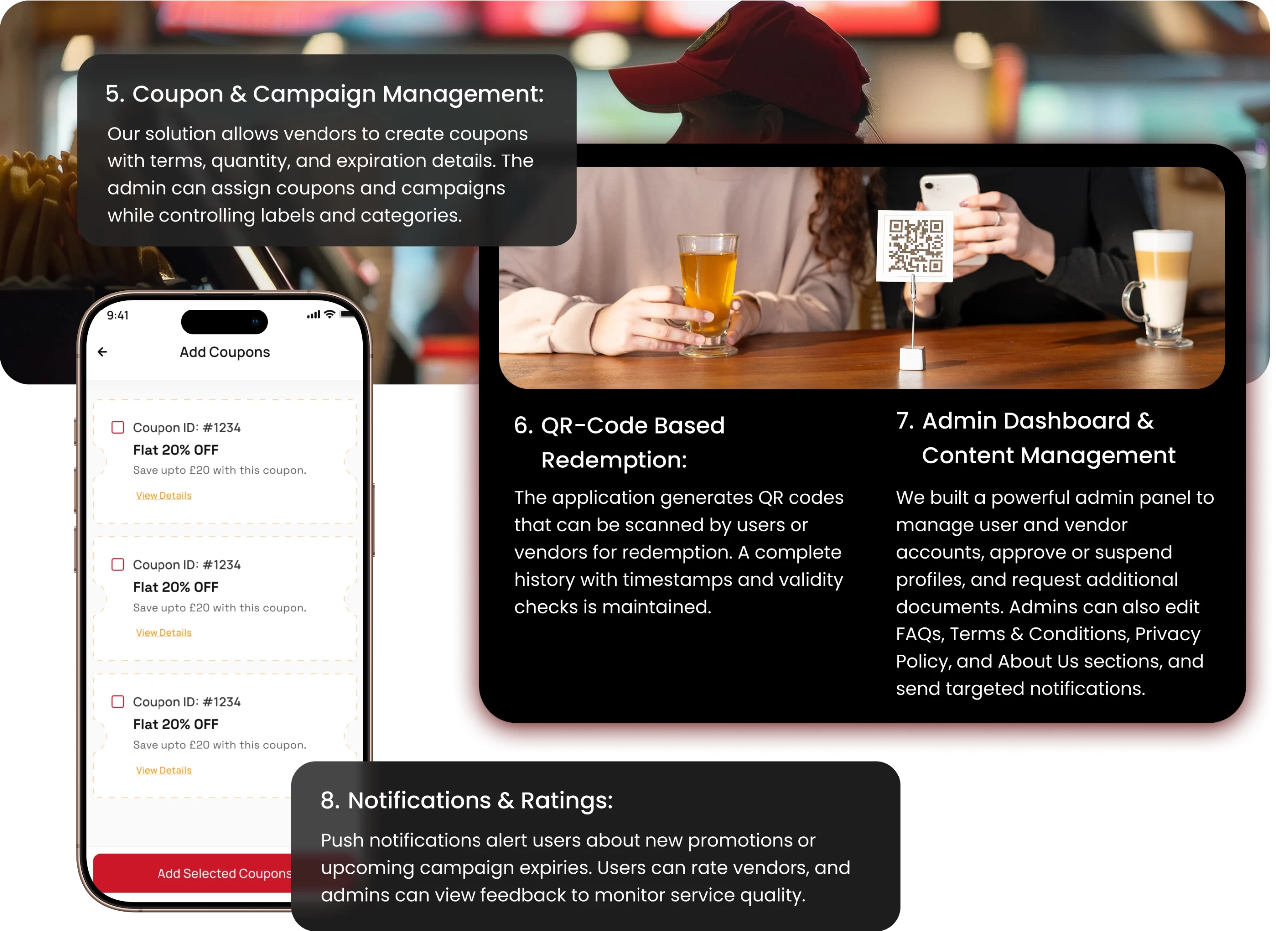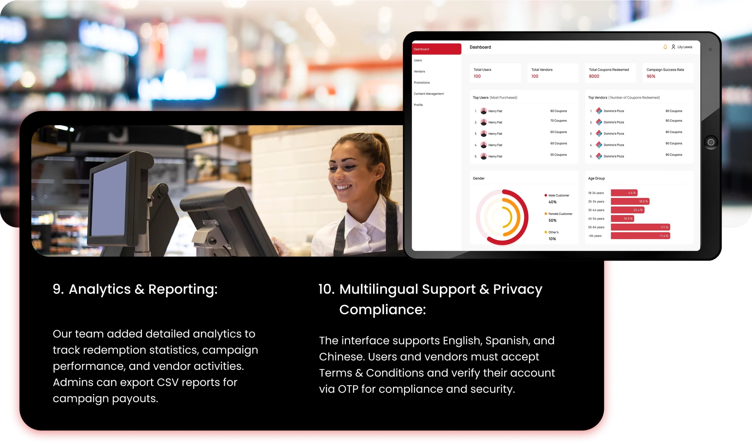 Our solution allows vendors to create coupons with terms, quantity, and expiration details. The admin can assign coupons and campaigns while controlling labels and categories.